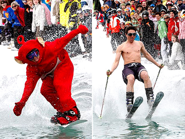 De teletubbies a corajosos sem camisa, os inusitados atletas deslizam sobre uma gelada piscina incorporada à neve em um resort em Morgins.